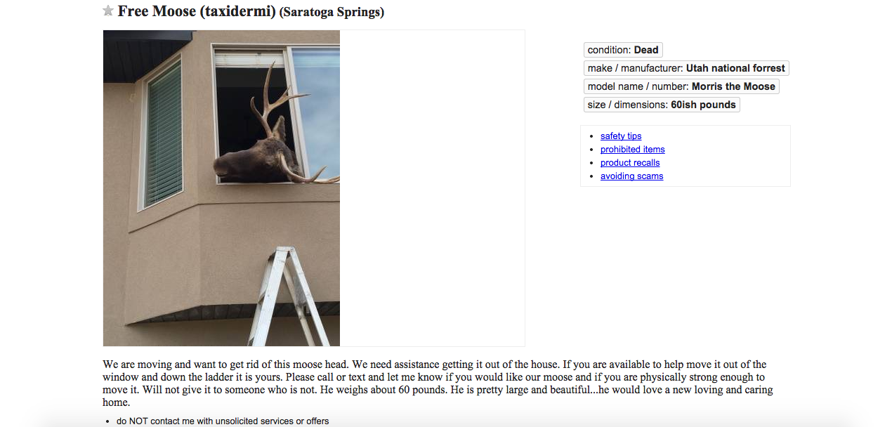 This cries out to me with the voice of a thousand angel babies. In my last post, I expressed my affinity for maimed animal parts hanging prominently in my home. This is a chance to right a terrible wrong—a shot at redemption. However: I am savvy to the earth's position in relation to the sun, and how our path as we hurdle endlessly through space around a feebly burning ball of compact elements has been arbitrarily organized into a series of evenly divided sectors to make sense of the abstract and limited concept of time. Therefore, I know that our current position has been designated an appropriate one in which to affront one another with falsehoods and pranks in an attempt to mock and ridicule... Harumph. As if it were even real. As if I would even want that patrician beast's fuzzy noggin ennobling my harrowed heart. I won't be had again. I won't.